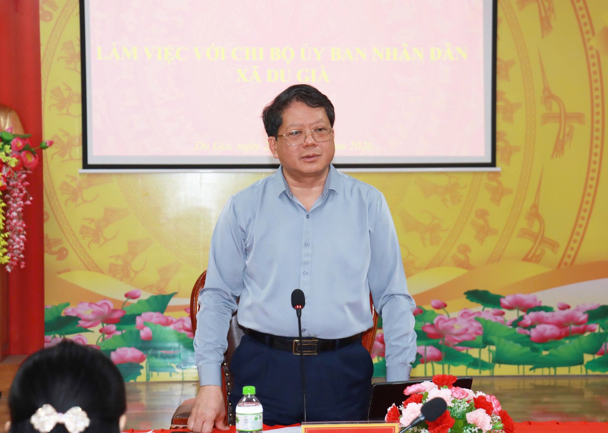 Tại buổi làm việc, Chi bộ UBND xã Du Già đã báo cáo kết quả lãnh đạo, chỉ đạo thực hiện nhiệm vụ chính trị, tập trung vào việc quán triệt, triển khai các nghị quyết của Đảng, nhất là Nghị quyết Đại hội XIV của Đảng và Nghị quyết Đại hội Đảng bộ tỉnh nhiệm kỳ 2025 – 2030. Việc học tập, quán triệt được tổ chức nghiêm túc, linh hoạt, đảm bảo cán bộ, đảng viên tham gia đầy đủ, từng bước đưa nghị quyết vào cuộc sống. Công tác lãnh đạo thực hiện nhiệm vụ chính trị được triển khai đồng bộ, trong đó nổi bật là việc tổ chức thành công cuộc bầu cử đại biểu Quốc hội khóa XVI và đại biểu HĐND các cấp nhiệm kỳ 2026 – 2031 đảm bảo đúng quy trình, quy định, phát huy dân chủ với tỷ lệ cử tri tham gia đạt 100%. Sau khi thực hiện mô hình chính quyền địa phương 2 cấp, chi bộ UBND xã Du Già đã nhanh chóng ổn định tổ chức, ban hành quy chế làm việc, phân công nhiệm vụ cụ thể; phát huy vai trò hạt nhân chính trị trong lãnh đạo, chỉ đạo hoạt động của cơ quan, đơn vị. Bộ máy chính quyền vận hành cơ bản thông suốt, hiệu quả; công tác cải cách hành chính, giải quyết thủ tục cho người dân được duy trì ổn định, không để gián đoạn. Đồng thời, chú trọng công tác giáo dục chính trị, tư tưởng; kịp thời nắm bắt tâm tư, nguyện vọng của cán bộ, đảng viên, tạo sự đồng thuận trong quá trình sắp xếp tổ chức bộ máy. Cùng với đó, chi bộ đã tập trung lãnh đạo thực hiện nhiệm vụ phát triển kinh tế - xã hội, đảm bảo quốc phòng - an ninh; quan tâm xây dựng Đảng, nâng cao chất lượng sinh hoạt chi bộ, phát huy vai trò nêu gương của cán bộ, đảng viên.