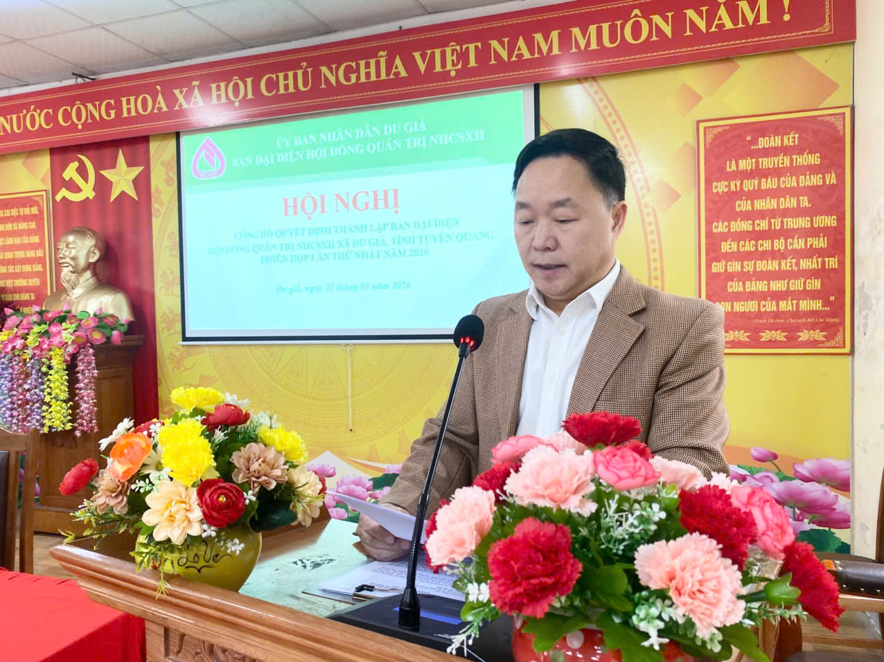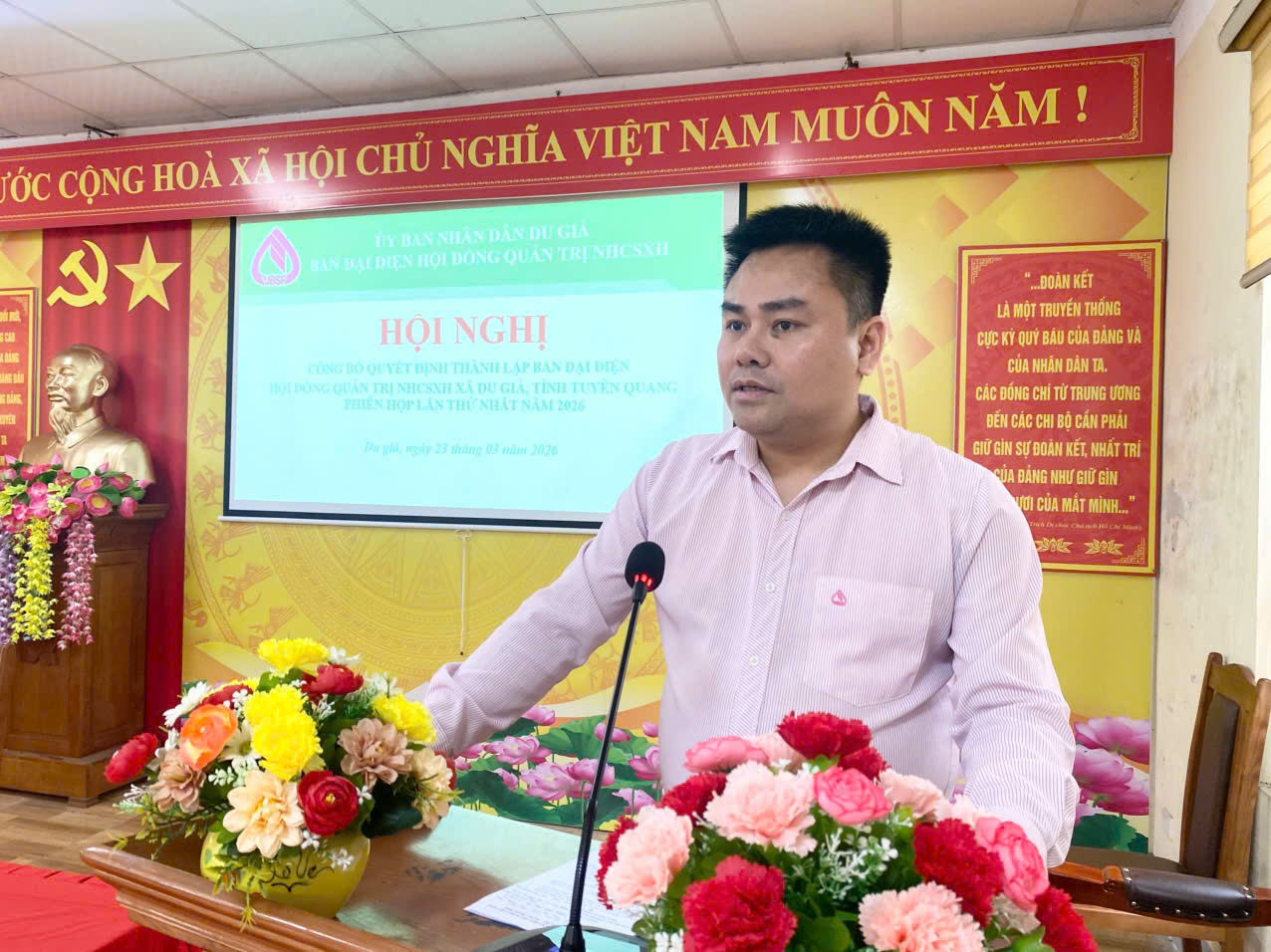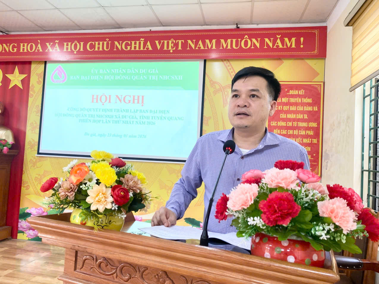 Chiều 23.3, Uỷ ban nhân dân xã Du Già tổ chức hội nghị công bố Quyết định thành lập Ban Đại diện Hội đồng quản trị Ngân hàng Chính sách xã hội ( NHCSXH) xã Du Già, tỉnh Tuyên Quang, phiên họp lần thứ nhất năm 2026. Tham dự có đồng chí Thào Mí Chá, Phó bí thư Thường trực Đảng uỷ; Nguyễn Đình Phúc, Phó bí thư, Chủ tịch UBND xã; Hoàng Văn Mấm, Phó Chủ tịch UBND xã; Lãnh đạo Uỷ ban MTTQ Việt Nam xã; Lãnh đạo Phòng giao dịch NHCSXH Yên Minh; Lãnh đạo các tổ chức chính trị - xã hội; các cơ quan, đơn vị xã, Tổ trưởng Tổ vay vốn trên địa bàn xã.
